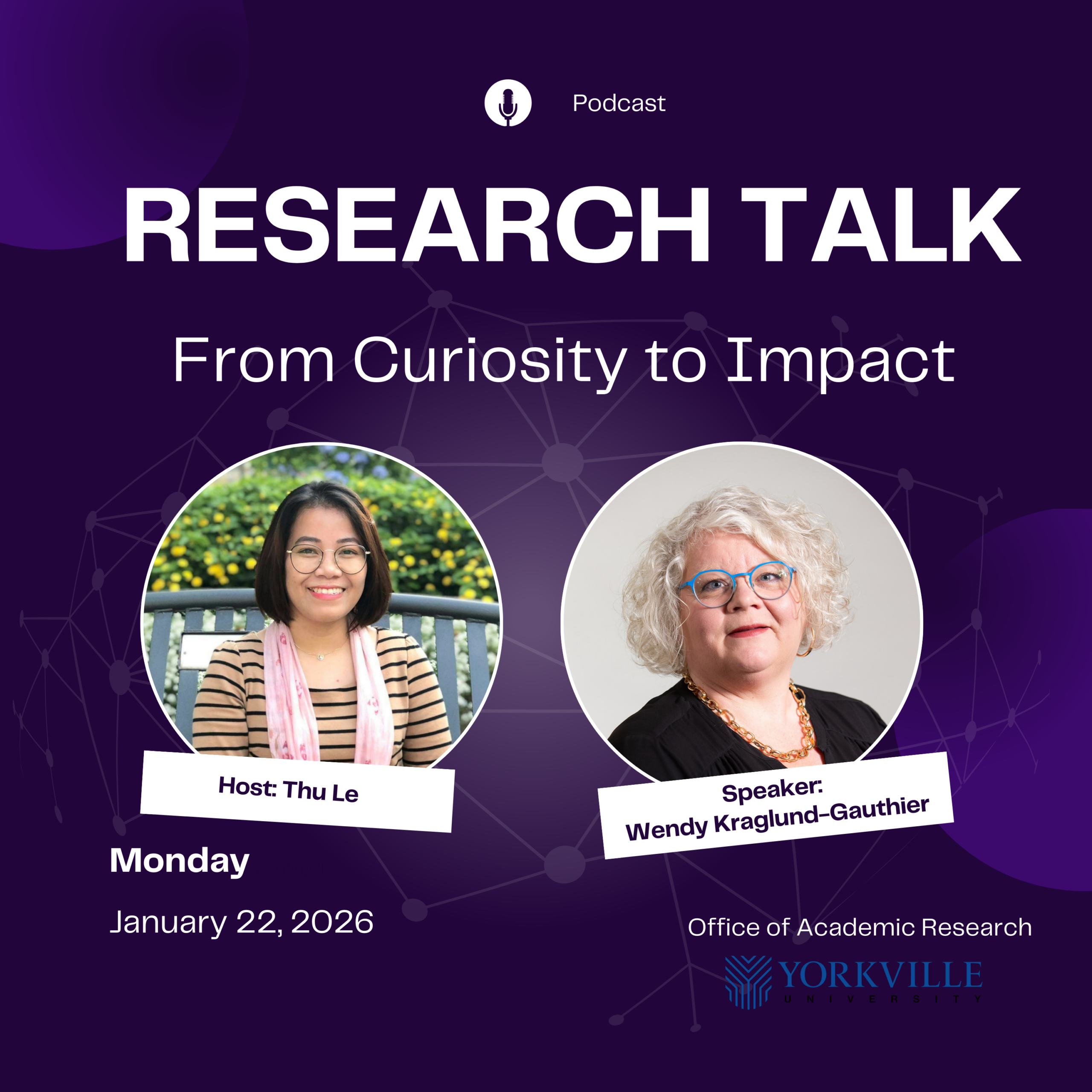 Research Talk is an inspiring podcast series that brings research to life at Yorkville University through the art of storytelling. Each episode spotlights one faculty member, offering a reflective and engaging space to share the personal journey behind their scholarly work: How ideas were born, challenges were navigated, and meaningful lessons were learned along the way.